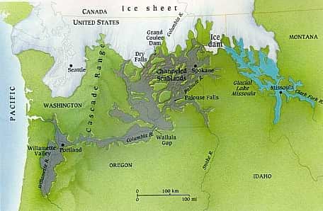 The image below indicates where the Scablands are and where the geologists believed was the likely source of the water like Glacial Lake Missoula that was created by an Ice Dam. It is believed that once the Ice Dam broke, the water flowed from the Lake to create the Scablands. This theory has several problems, one is that not enough water could be held back by an ice dam to cause the erosion effects that occurred. In order to explain this differential, the current theory is that this happened as many as 80-90 times over thousands of year.