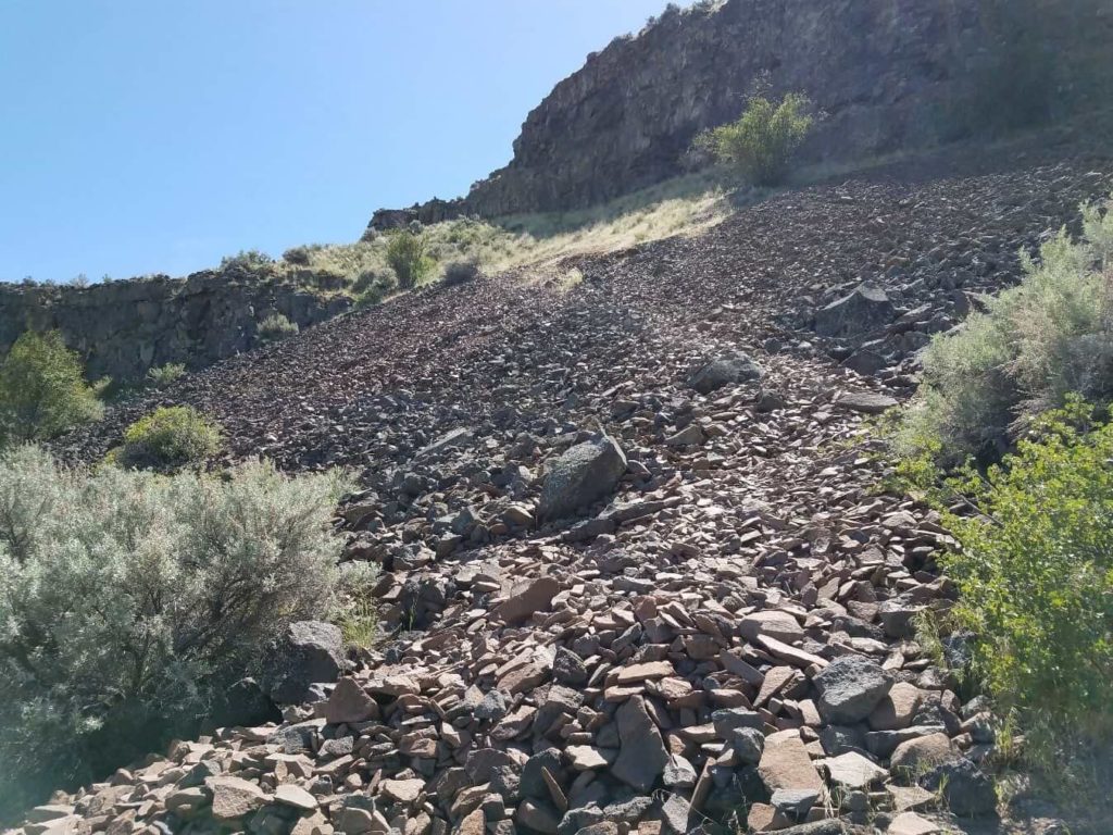 Below is the beginning of the upwards path that I was able to see from the north pathway of the Babcock Coulee side. The beginning was loose fractured rock fall-off from the basalt cliffs above. As I got higher, it became more rock like overlaid with dirt and gravel and in parts, more stable. This photo does not demonstrate the steepness of the trail but it does help illustrate the footing.